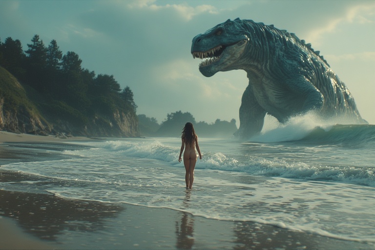 Beautiful woman stands on the beach in front of a giant sea monster - Р5.jpg