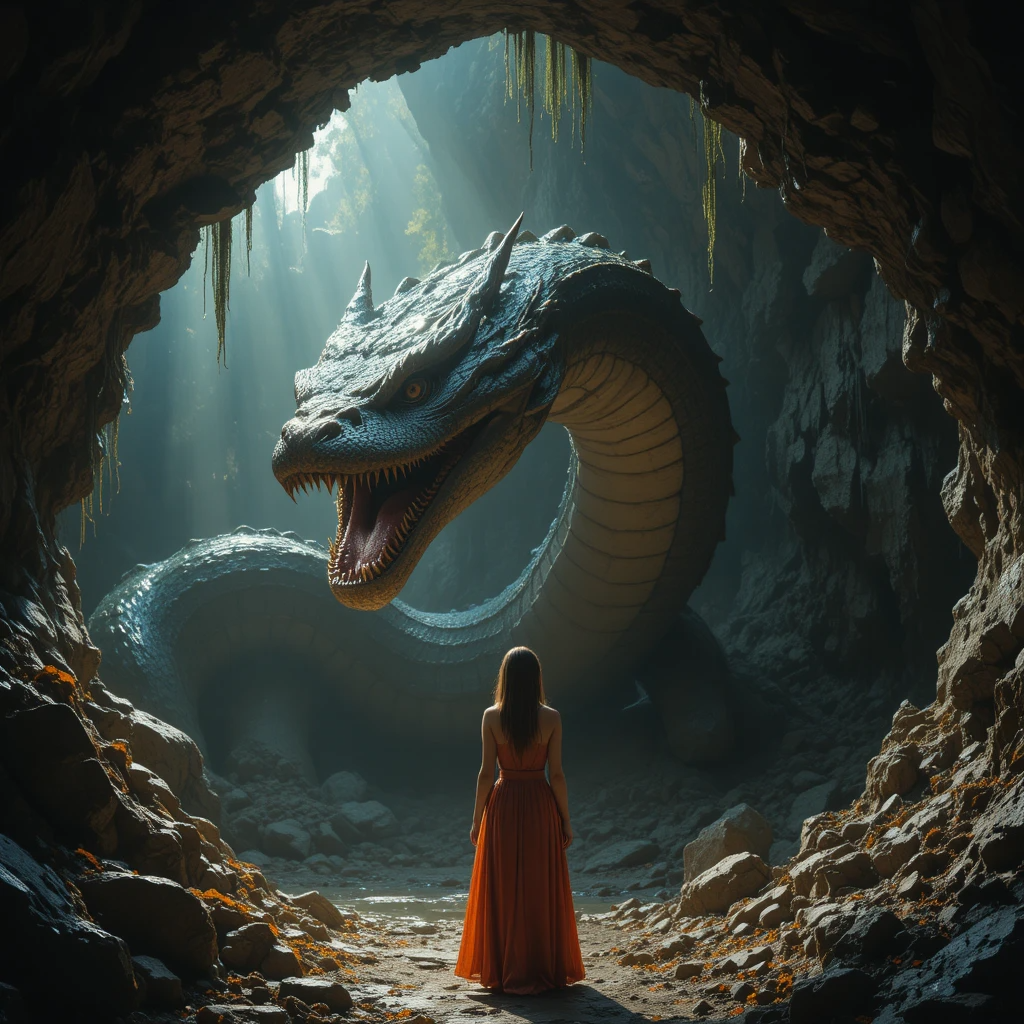 Beautiful woman stands inside the cave in front of a giant serpent - P1.jpg
