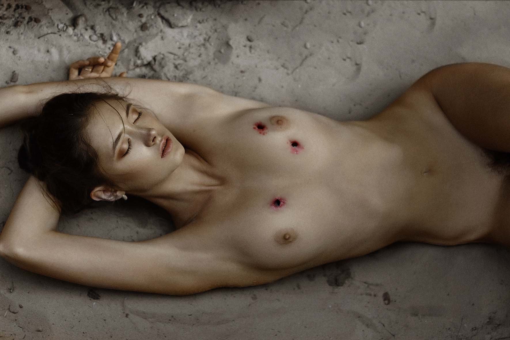 Camera views. I imagine a critical wounded victim looking up, watching the next naked body to come crashing down.