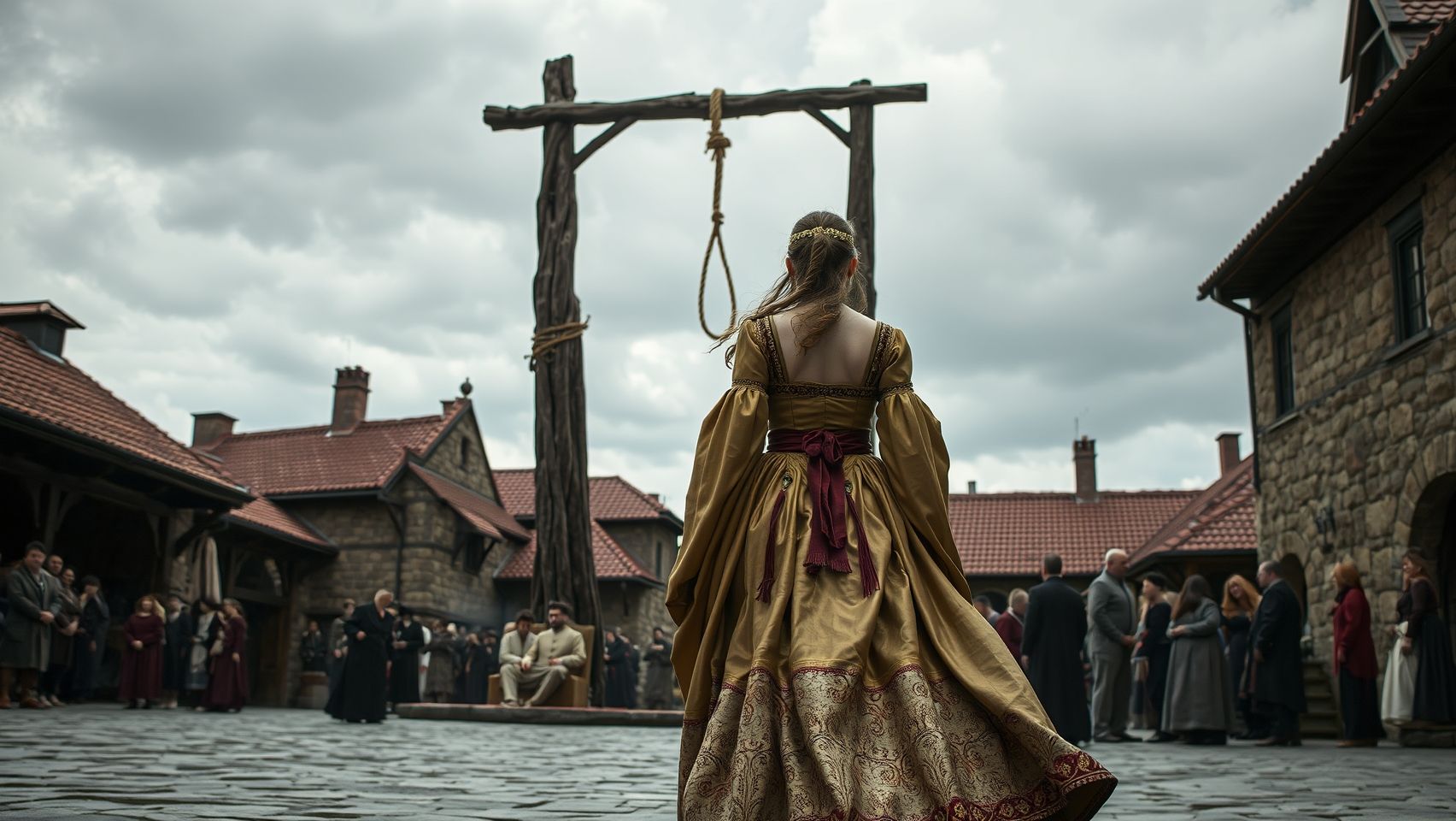 A medieval woman walks towards gallows.jpg