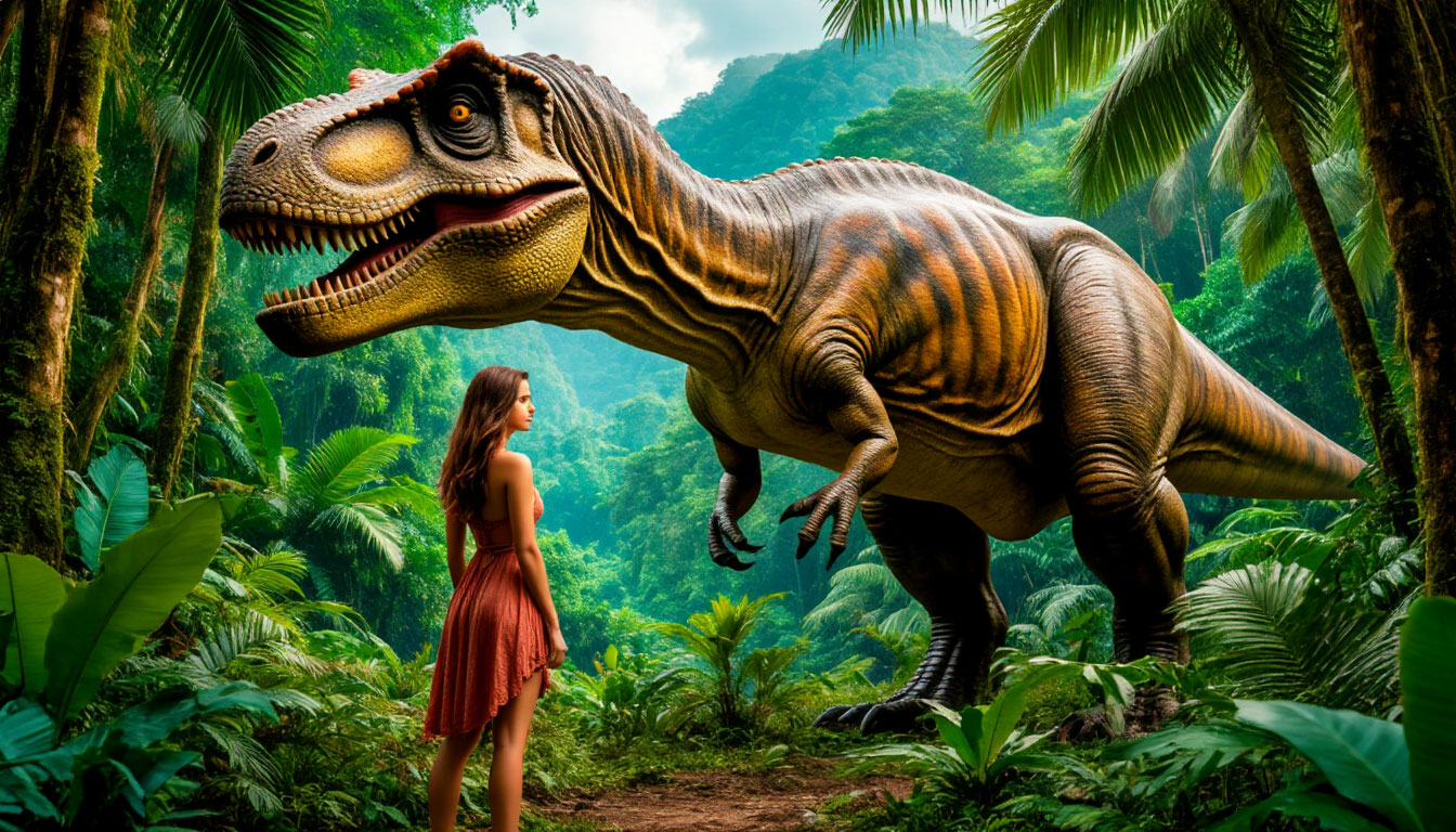 Beautiful woman stands in the jungle in front of a giant dinosaur - S1.jpg