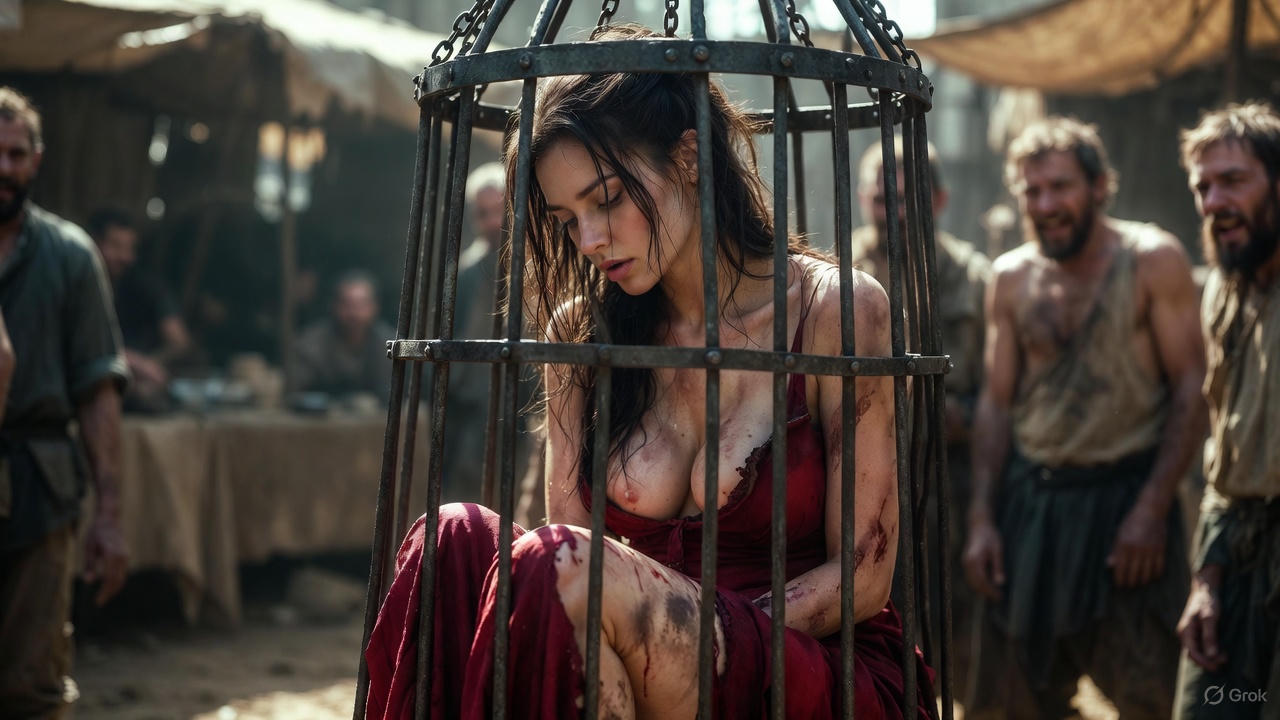 Beautiful woman sits inside tight cage in medieval city square - P1.jpg