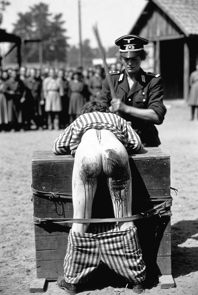 Тотальный фейк с претензией на реальность. Заключённые женских концлагерей СС брюк не носили; надзирательницы носили форму СС-Хельферин, а не вермахта; перед поркой привязывали к аналогу гимнастического козла и били хоть и больно - но с минимальными повреждениями (поэтому обычно резиновой дубинкой). Ибо наказанная сразу же после порки отправлялась на работу и должна была выдавать норму выработки.