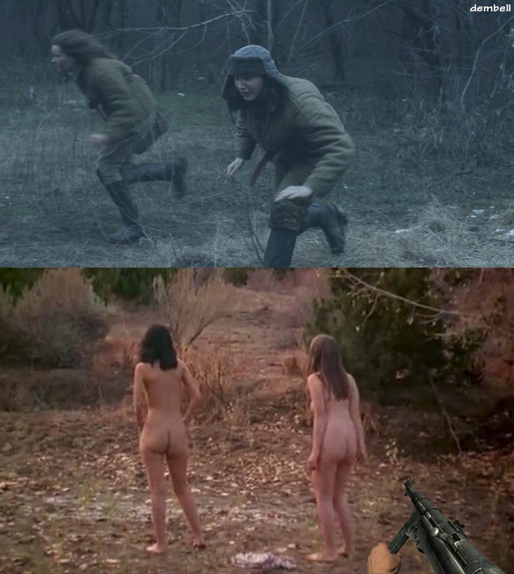 Ella undresses between her sisters as her naked father is slain in the background.