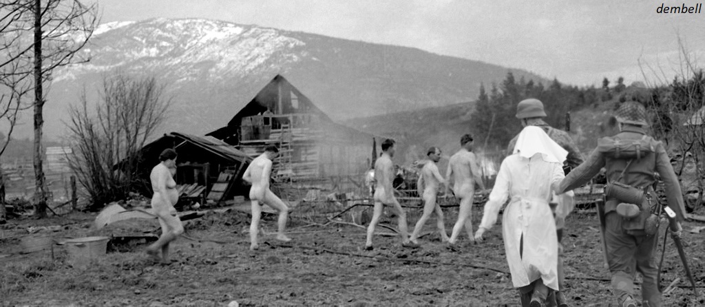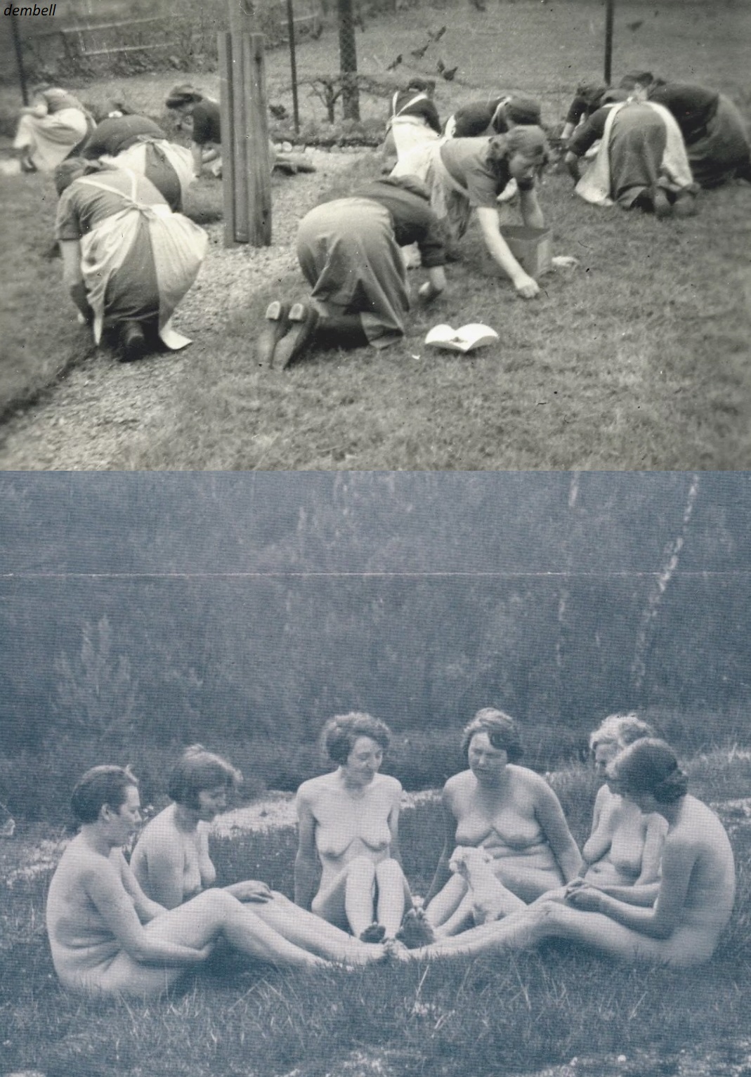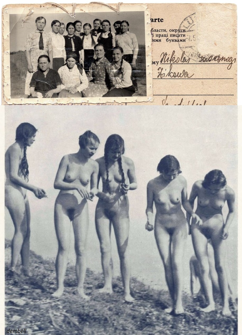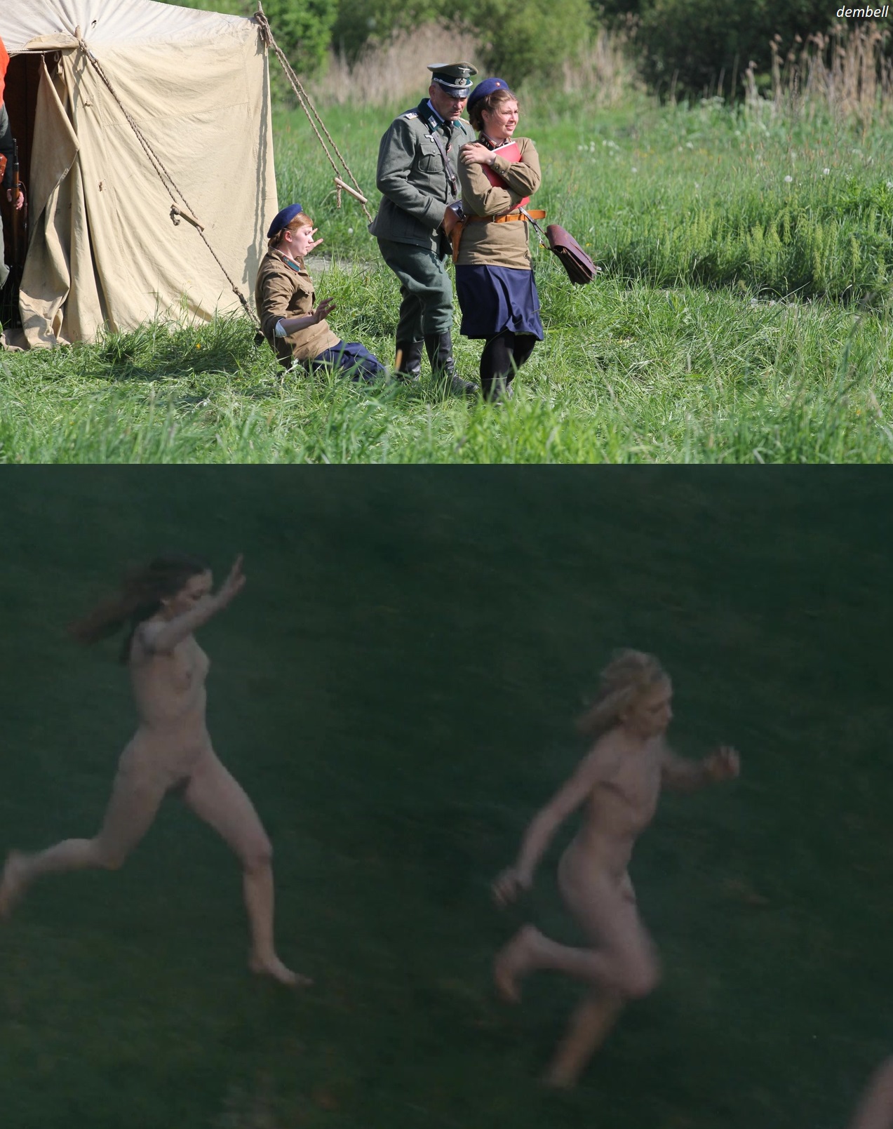 The bottom right looks right - if it is the inside of a gas chamber, although usually it was filled to capacity in any death camp. As for other nudity, Germans undressed (forced to undress) only Jews right before shooting them at the edge of a mass grave (or inside the grave). And not always - many (if not most) were shot fully dressed; in other cases in their undewear.