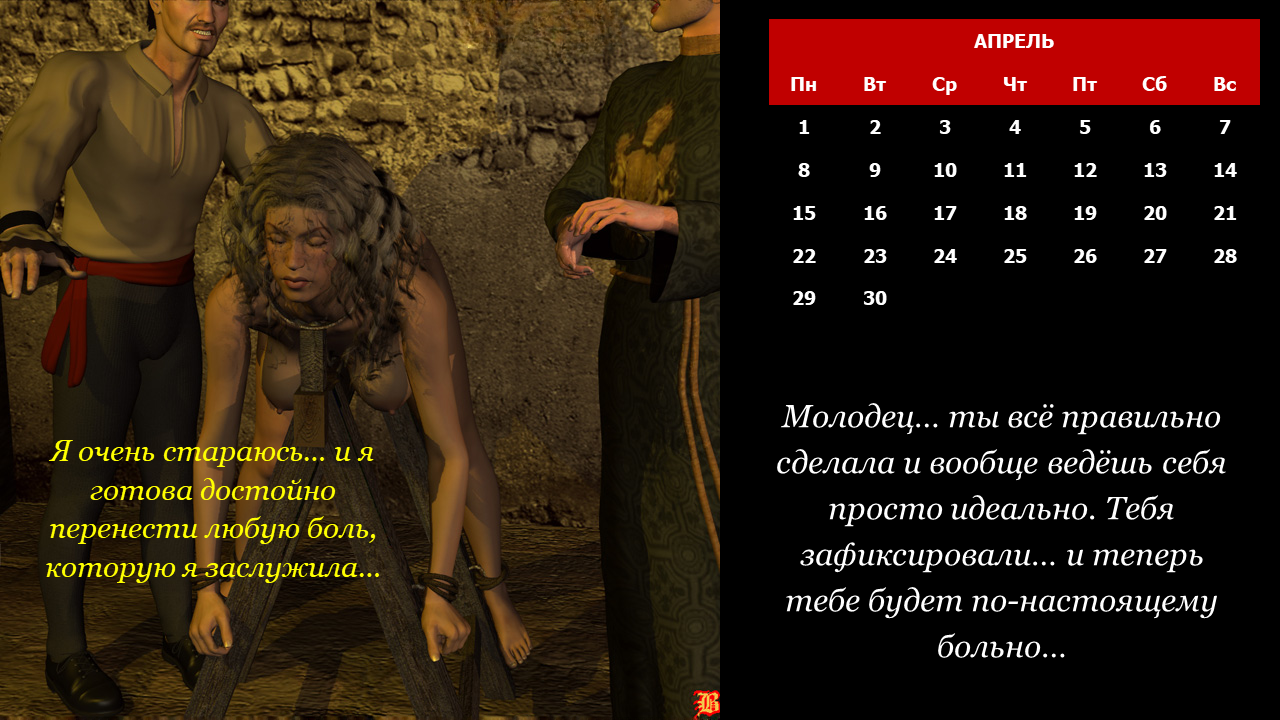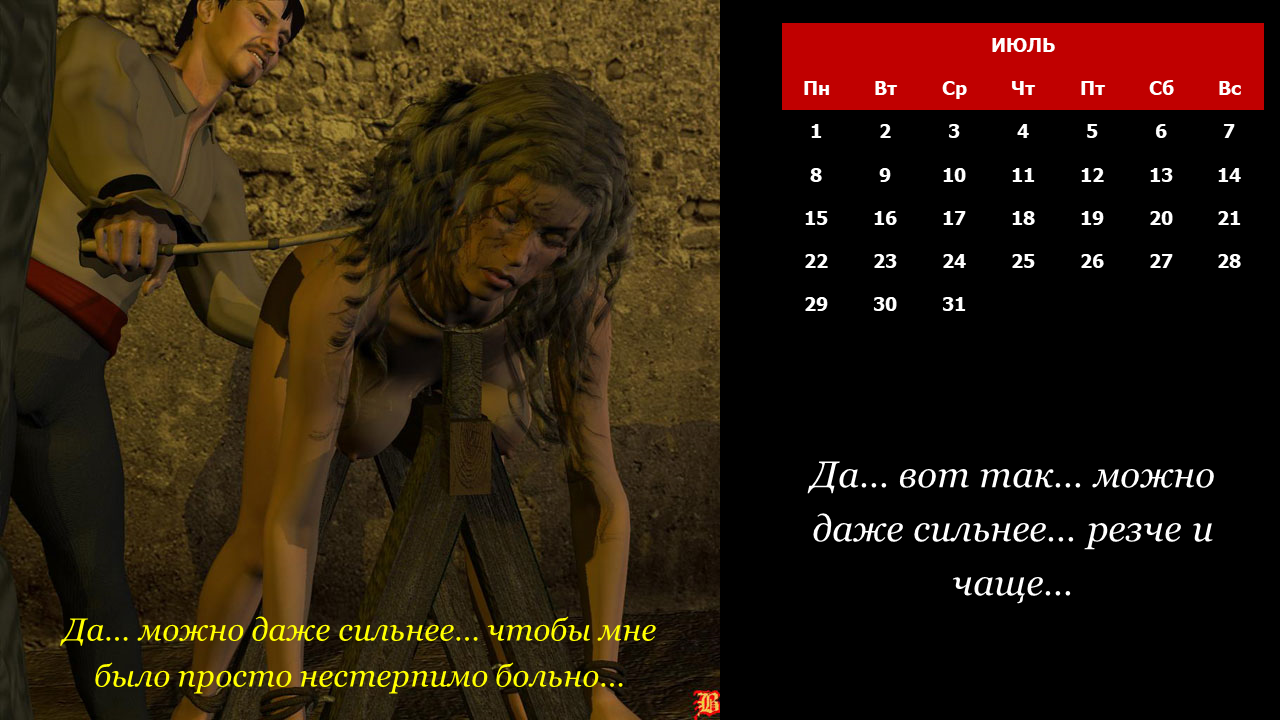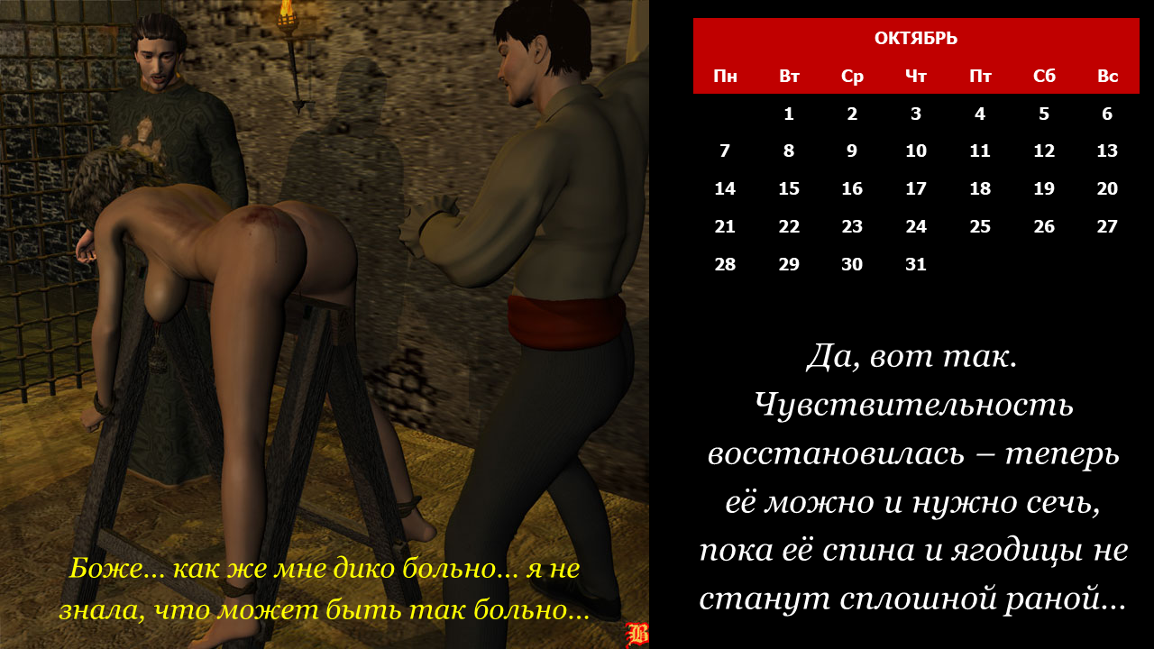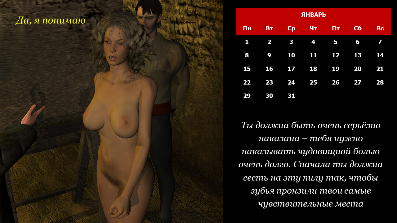 Для разнообразия сделал календарь на тему порки и пытки... точнее, истязания. Картинки не ахти, конечно... а вот сюжет комикса мне очень даже понравился. Исходный текст я удалил - есть такие инструменты в Сети - и заменил на свой. Сначала, как обычно, анимация... ну, а дальше будут уже слайды.