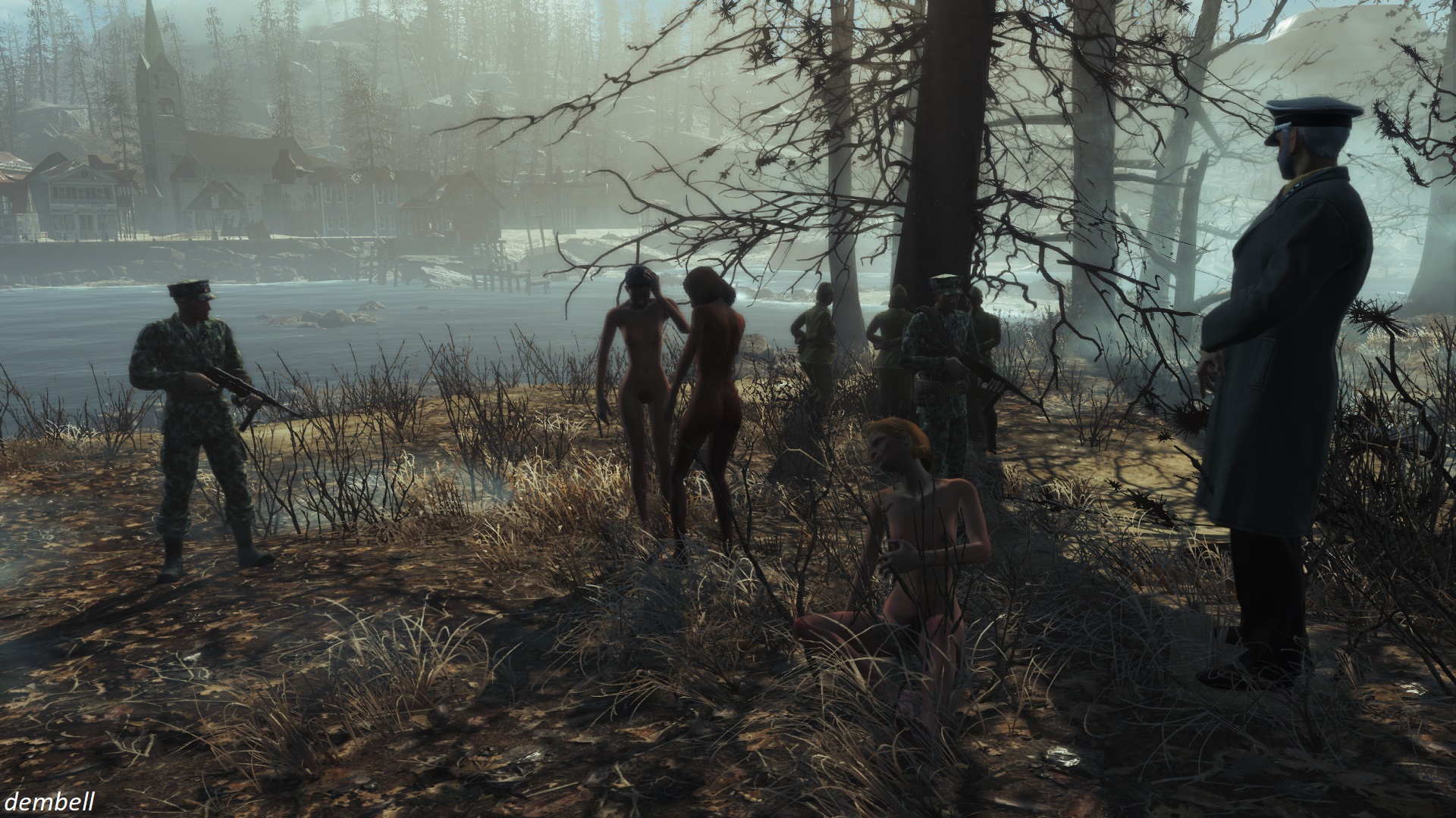 Her body squirms in agony, legs open, yet she is looked upon by German Soldiers.