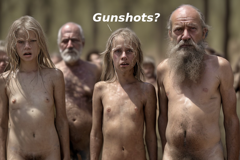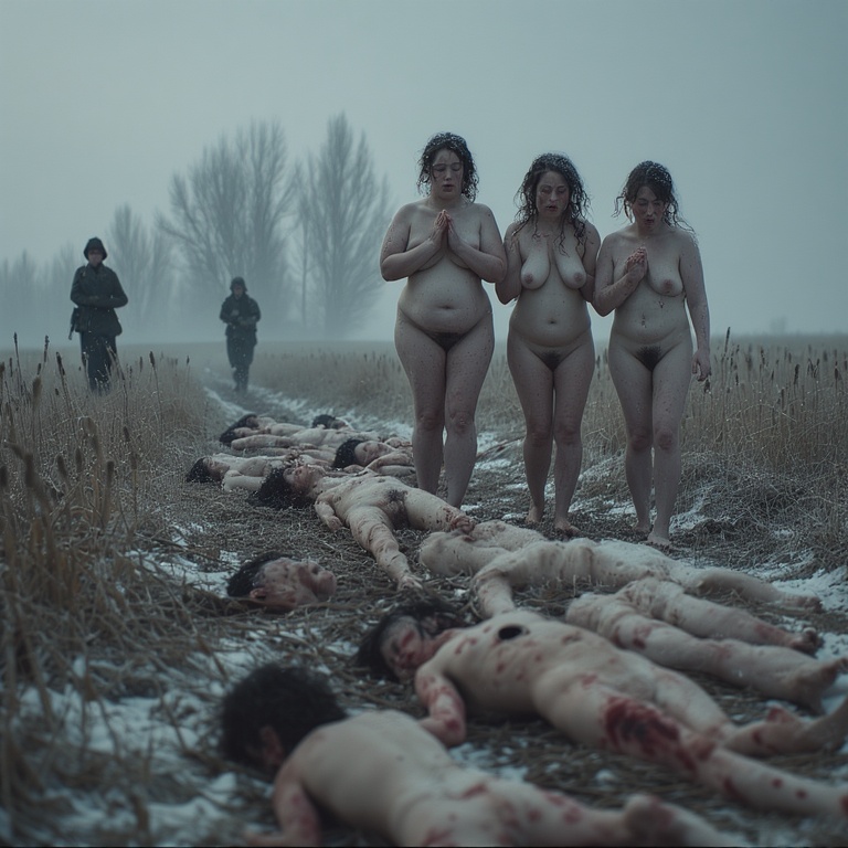 This is the text: "Close up, close up, overhead view, 3 mature women men teens children sleeping between many naked bodies piled together inside a large dirt pit, bodies twisted together, bodies stacked together, soldier gunman guarding nearby, broken neck, pubic hair, eyes bloodshot, penis, buttocks, soldier gunman walking, Soldier gunman sentry.