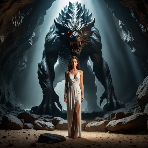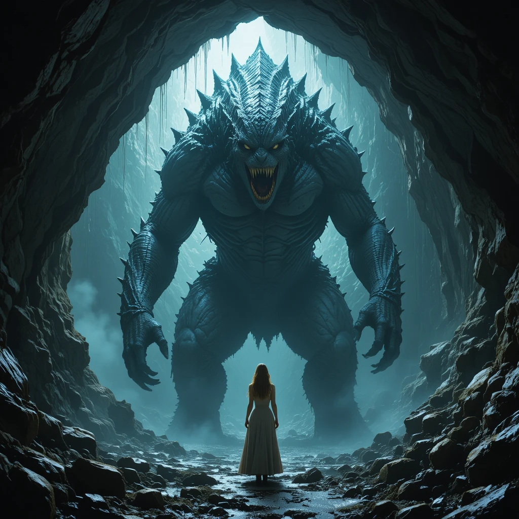 Beautiful woman stands inside the cave in front of a giant monster - P3.jpg