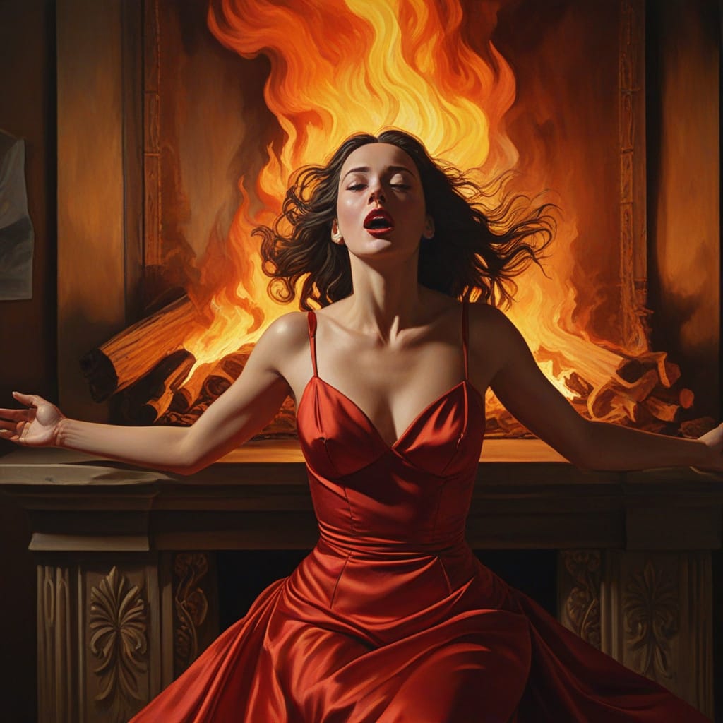Beautiful woman in red dress rising from roaring fire - АХ.jpg