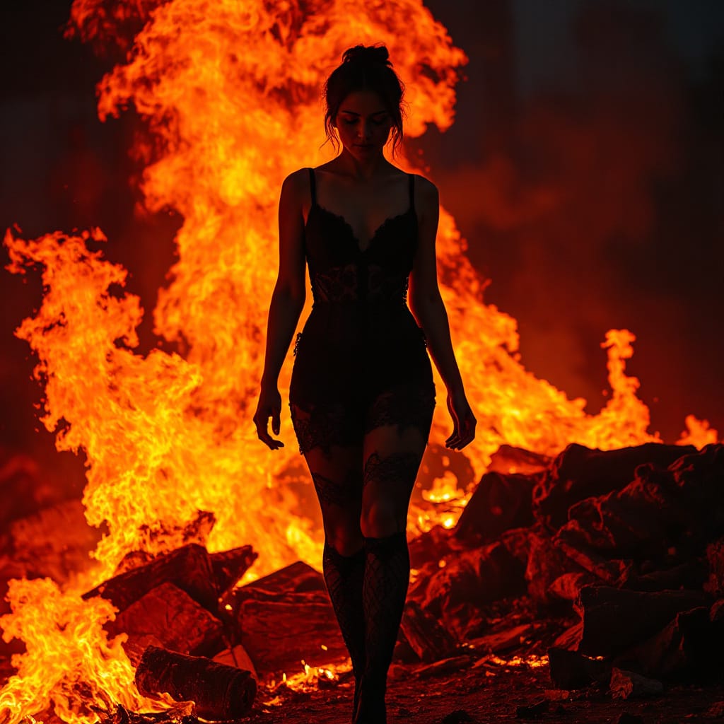 Beautiful woman in black  lacy underwear walking through roaring flame - JFL.jpg