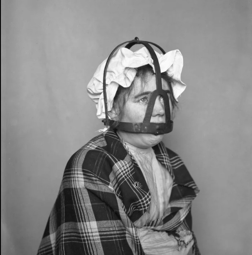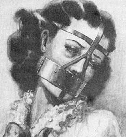 Фигурирует в фильме Brimsone (Преисподняя) 2016 года. Первоначально маску позора надевали на сварливых жён и на женщин, уличённых в проявлении грубости в общественном месте. Маска представляла собой металлическую конструкцию, надевавшуюся и закреплявшуюся на голове. В лицевой части конструкции находился острый металлический кляп в форме языка, который, при попытке говорить, серьёзно ранил язык и губы наказанной, так что говорить в такой маске не представлялось возможным.