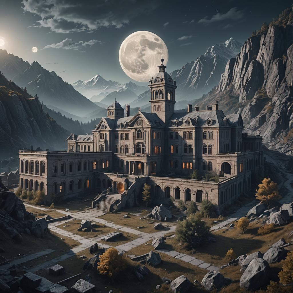 Colossal abandoned mental hospital in a mountain valley under full round grey moon.jpg