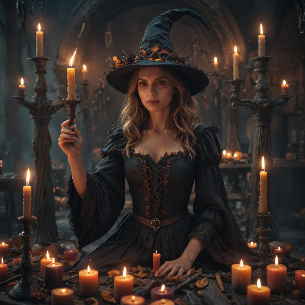 Beautiful witch surrounded by burning candles