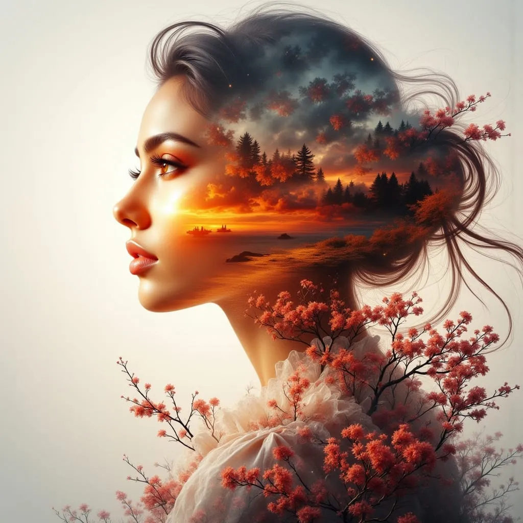 Göttin Silhouette Doppelbelichtung bei Sonnenuntergang.webp