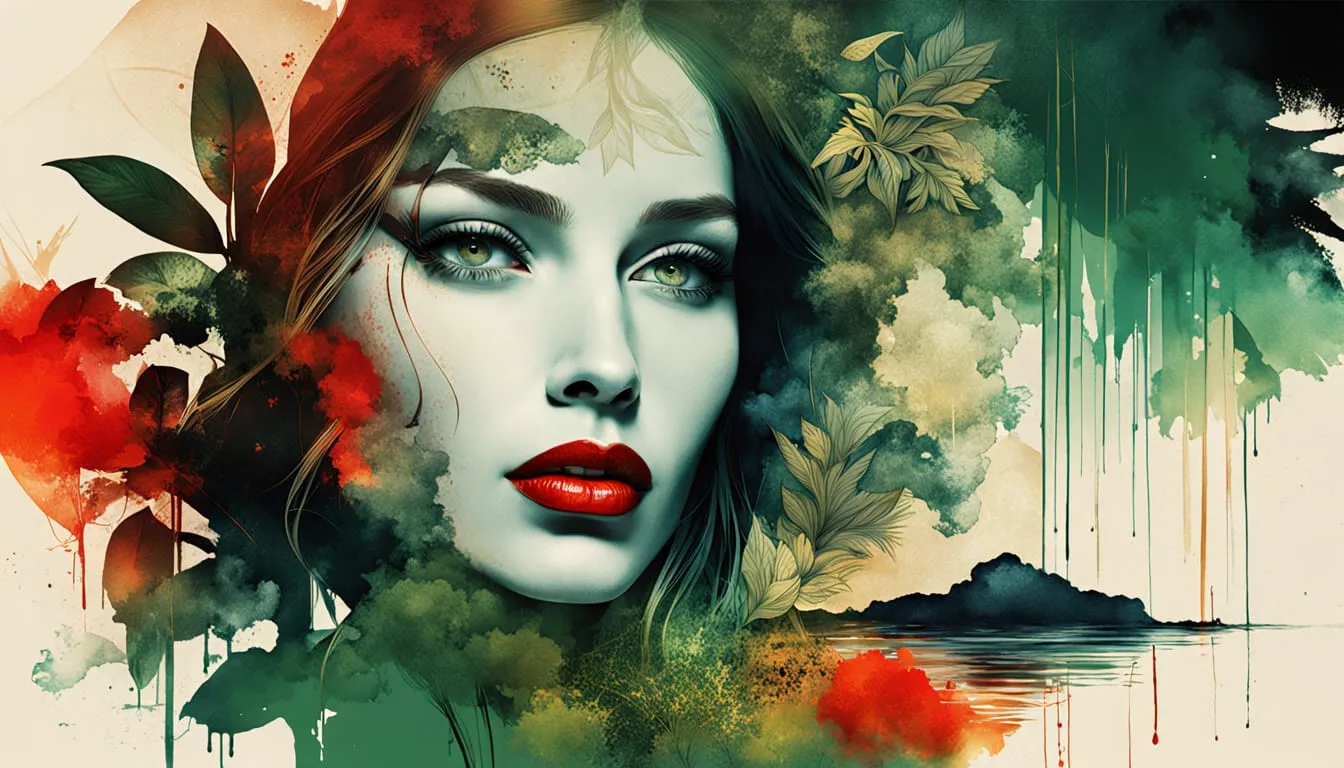 Göttin Silhouette Doppelbelichtung bei Sonnenuntergang.webp