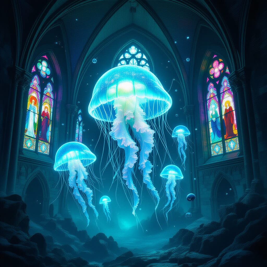 A bioluminescent jellyfish drifts through the ruins.jpg