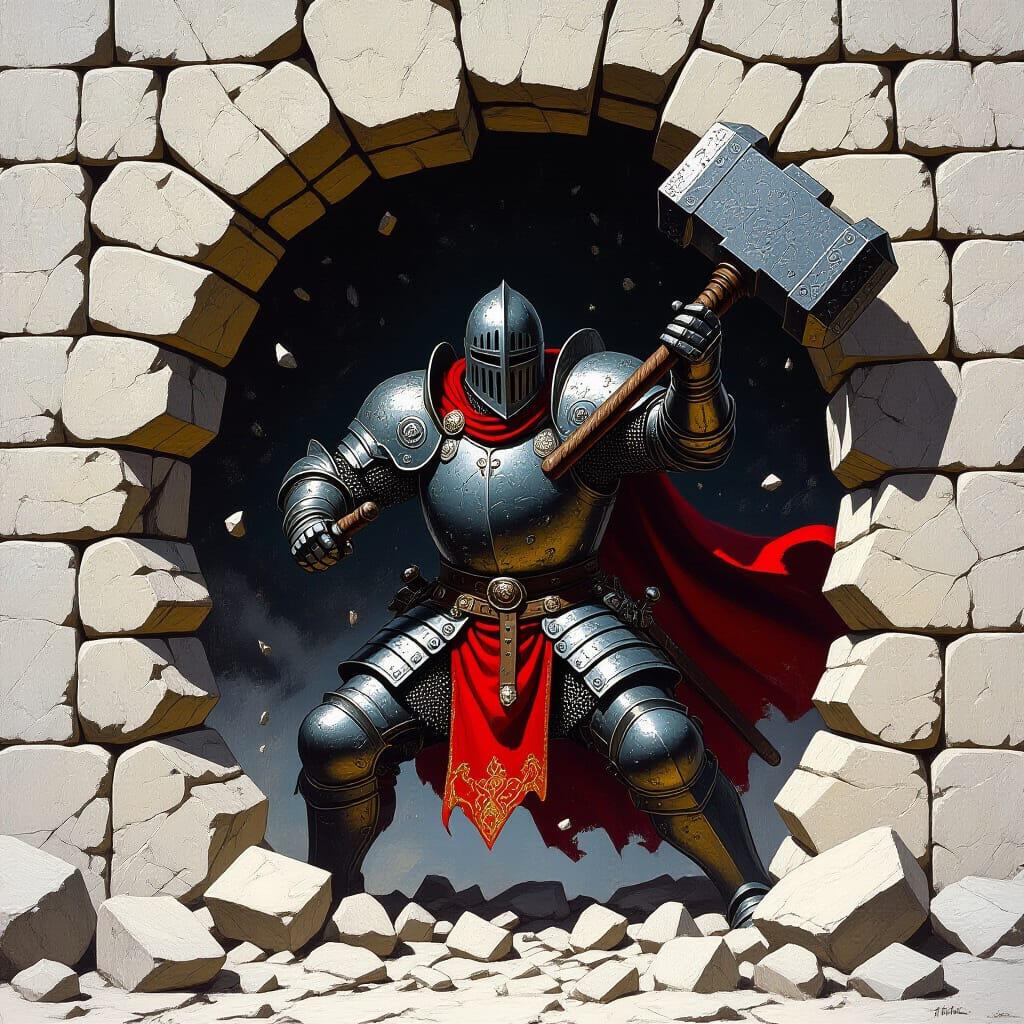 Medieval knight breaks through the wall with a giant hammer.jpg