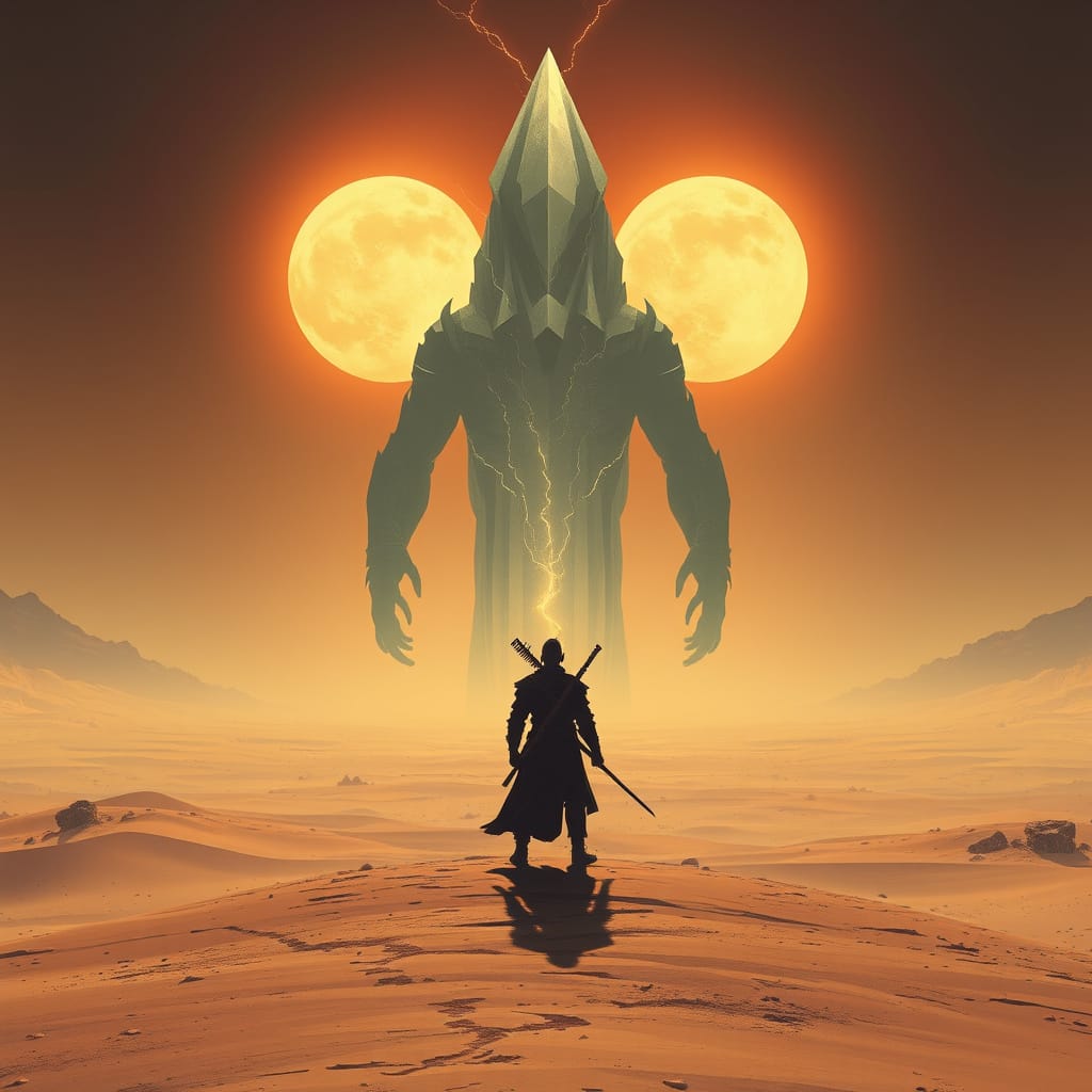 A lone samurai warrior stands on a windswept, alien desert planet.jpg