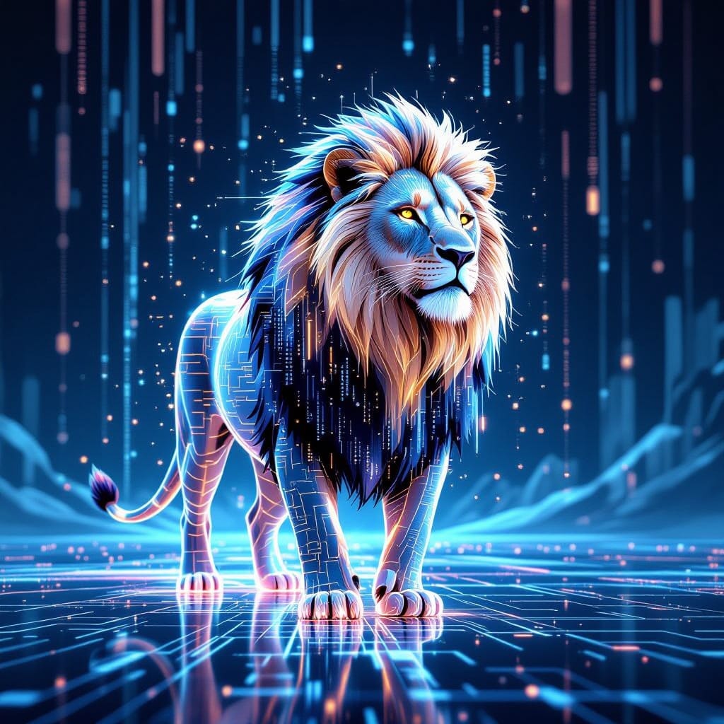 A majestic lion, its form composed of shimmering, interwoven lines of code - H11.jpg