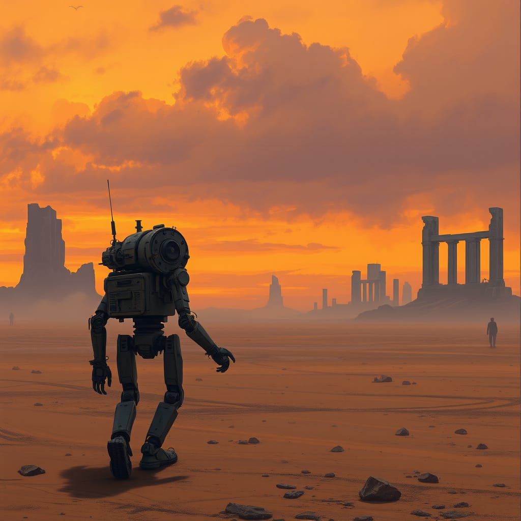 A lone, weathered robot traverses a desolate, wind-swept plain.jpg