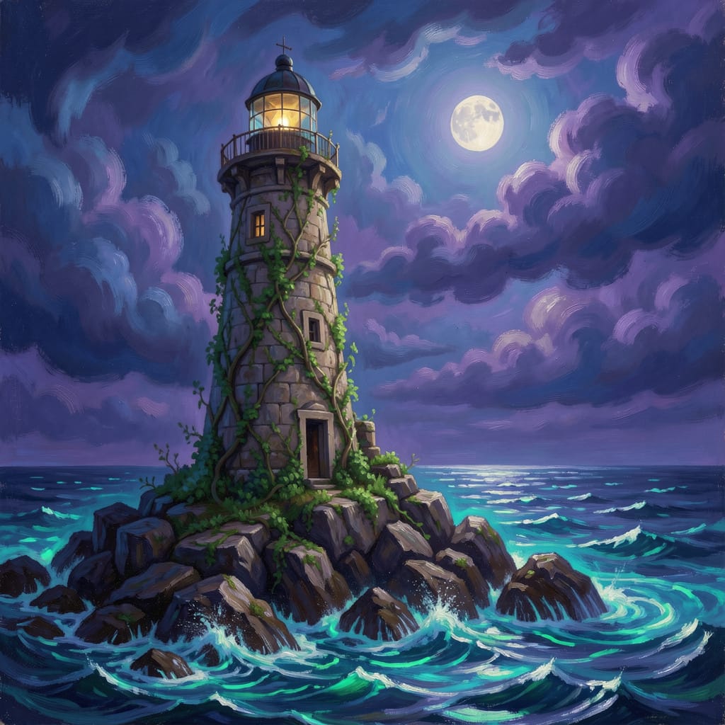 A lone, weathered lighthouse stands on a rocky outcrop.jpg