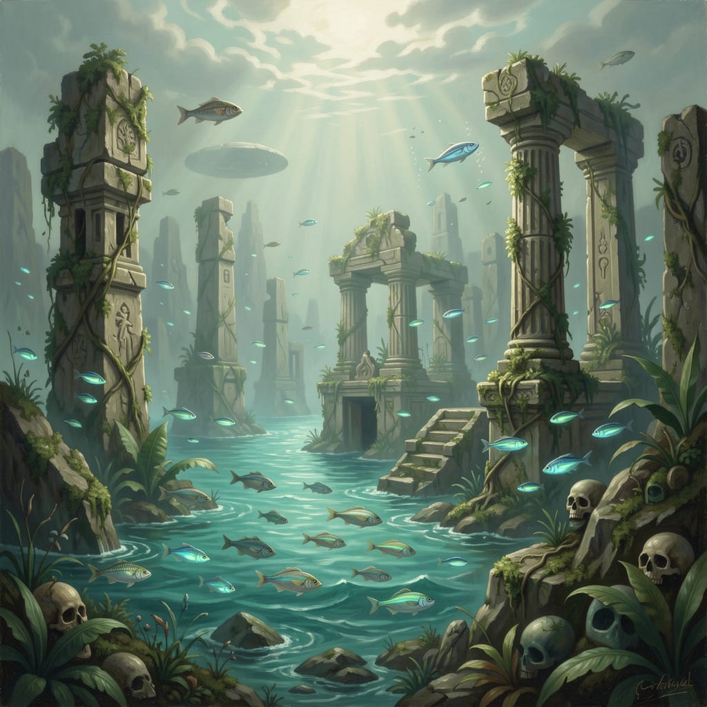 An ancient, overgrown city partially submerged in a turquoise ocean.jpg