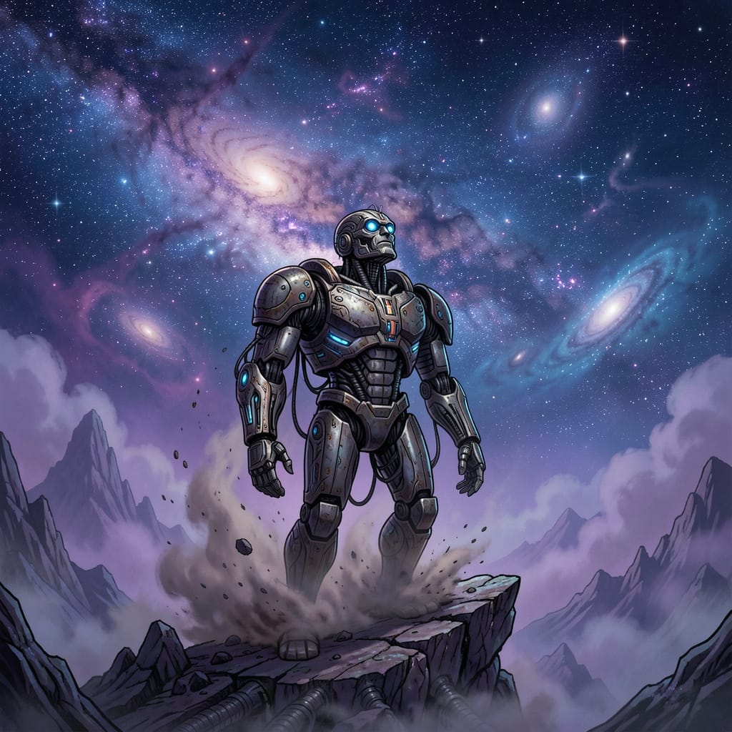 A solitary, ancient robot stands on a desolate mountain peak.jpg