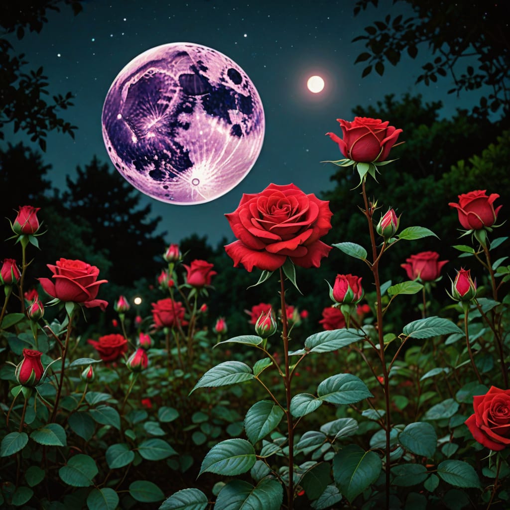 Red rose in magical garden under full round yellow moon.jpg