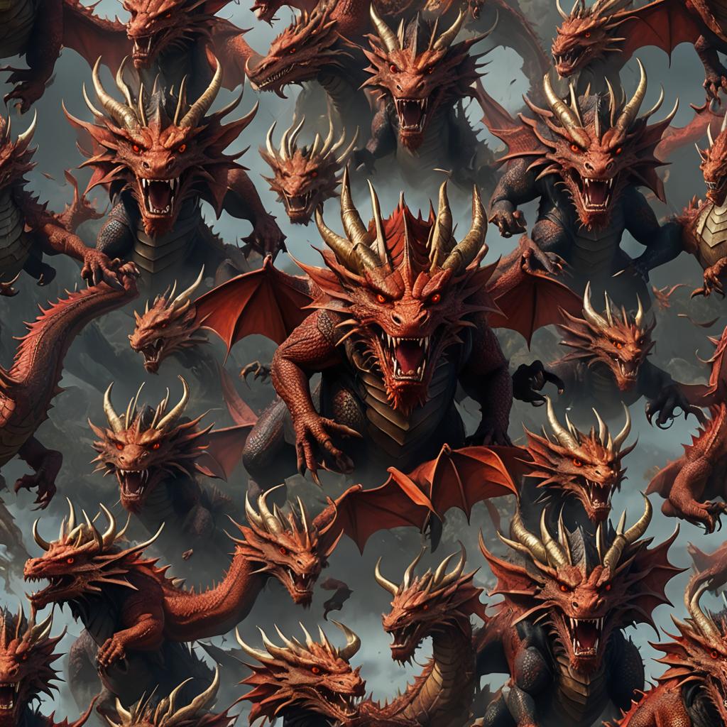 A great red dragon, with seven heads and ten horns, and seven diadems upon his heads (12:3)