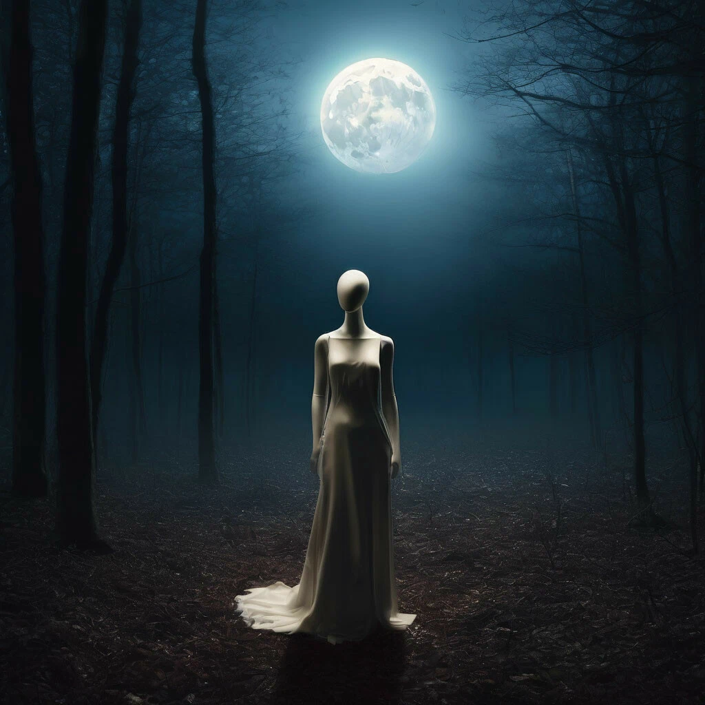 Женщина-манекен в лесу под полной круглой Луной.webp