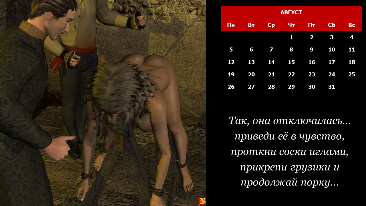 Для разнообразия сделал календарь на тему порки и пытки... точнее, истязания. Картинки не ахти, конечно... а вот сюжет комикса мне очень даже понравился. Исходный текст я удалил - есть такие инструменты в Сети - и заменил на свой. Сначала, как обычно, анимация... ну, а дальше будут уже слайды.