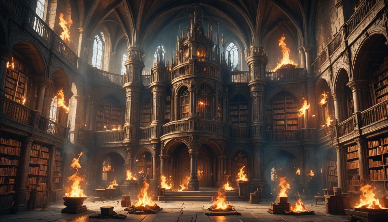 Burning magical library in a medieval castle