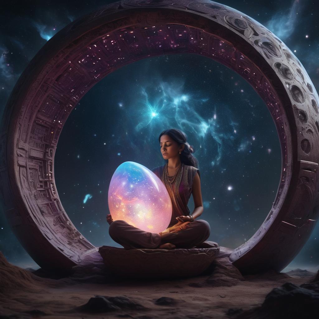 Beautiful Indian woman meditates inside a giant cosmic egg in deep space.jpg