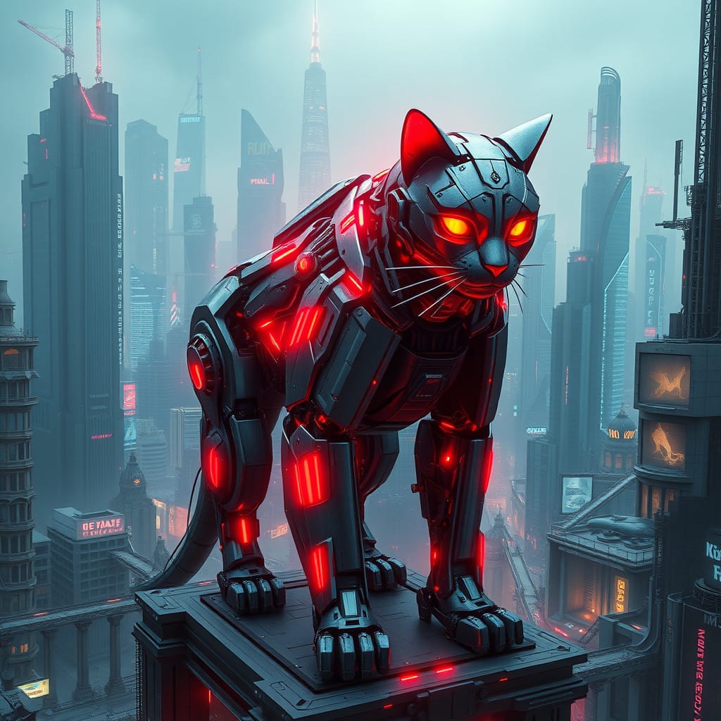 Giant mechanical cat in futuristic city.jpg