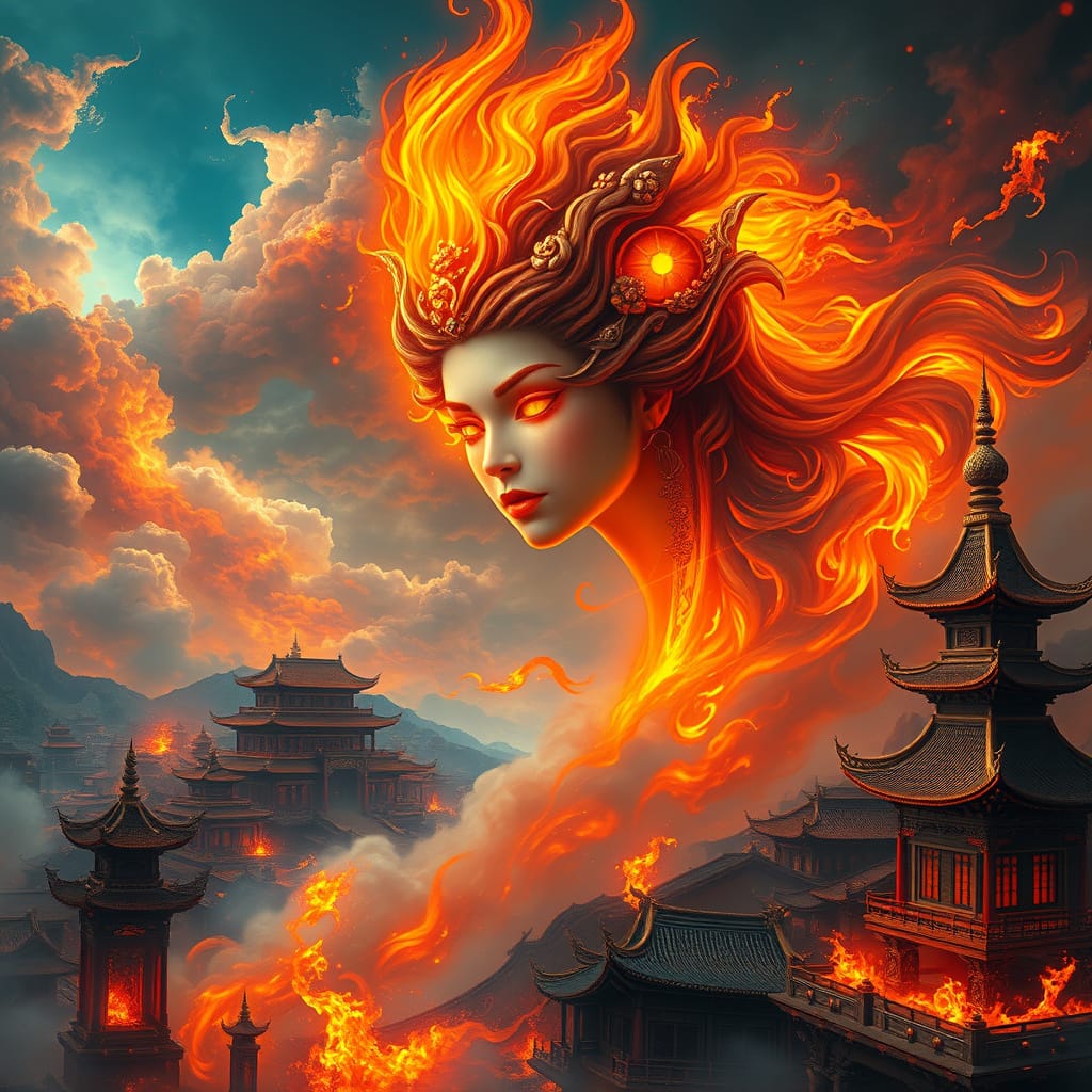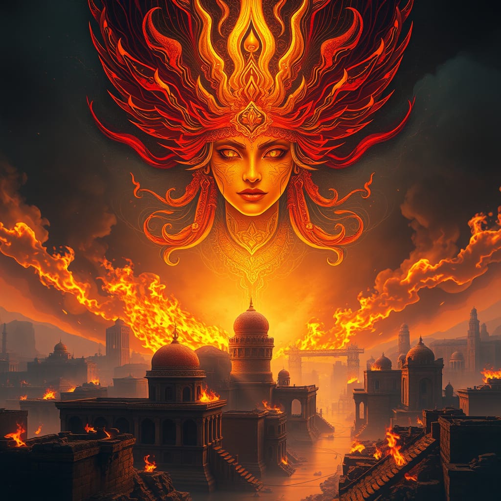 African Goddess of the Flame over burning ancient city.jpg