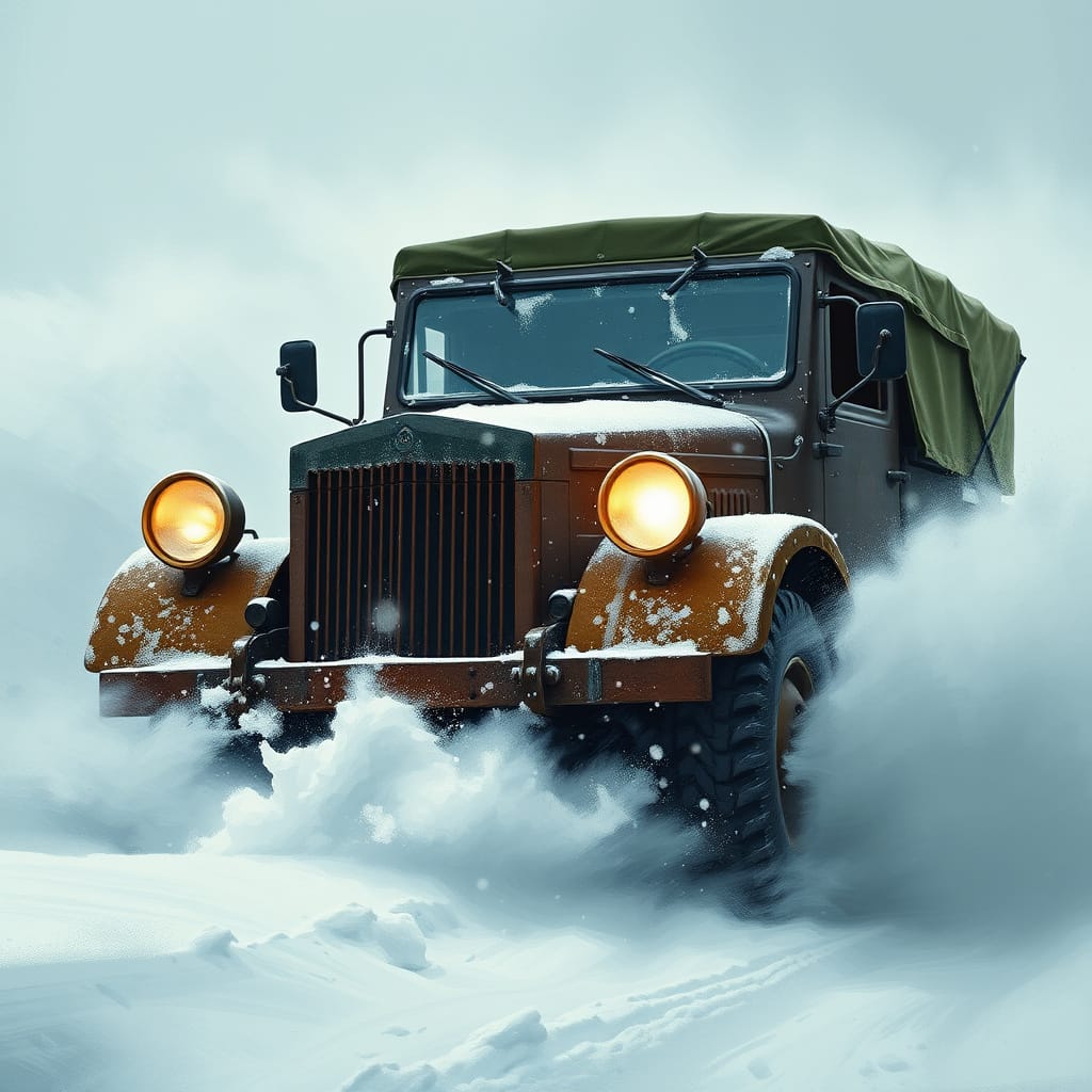 Vintage armoured car driving into vicious blizzard - 1.jpg