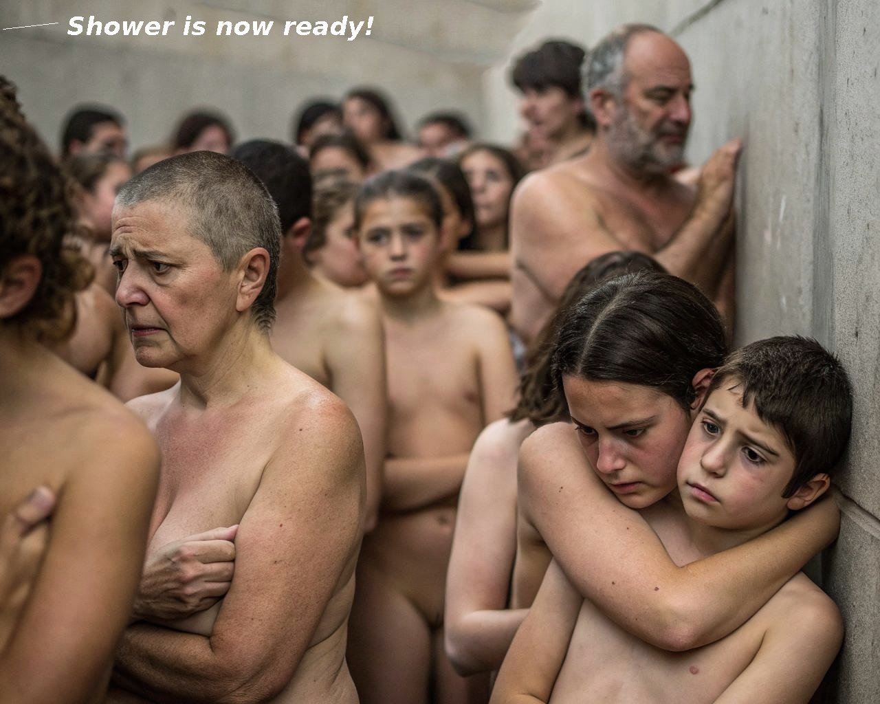 After being bumped and pushed by those behind, the people finally assemble in the "shower"