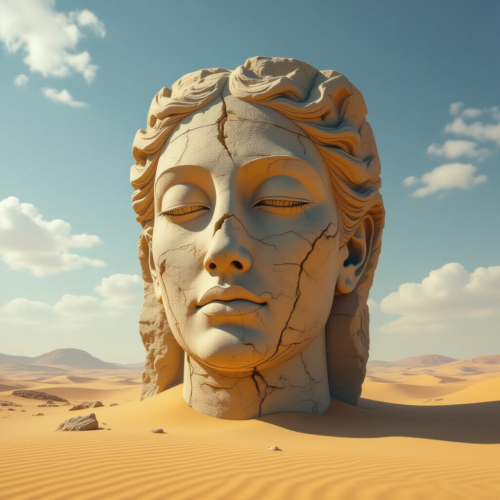 Giant woman's head made of stone in the desert under scorching sun.jpg