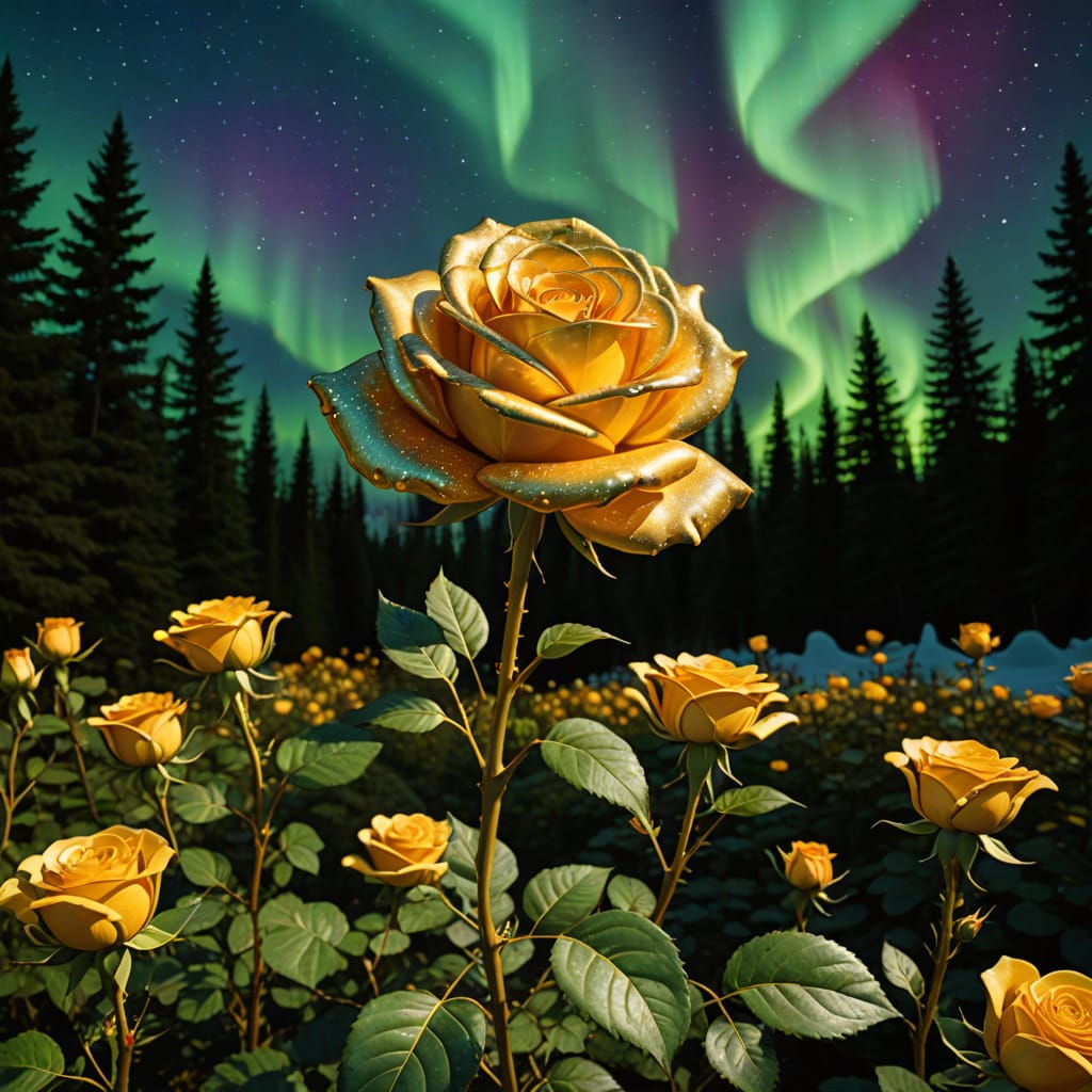 Giant golden rose in magical garden under aurora borealis.jpg