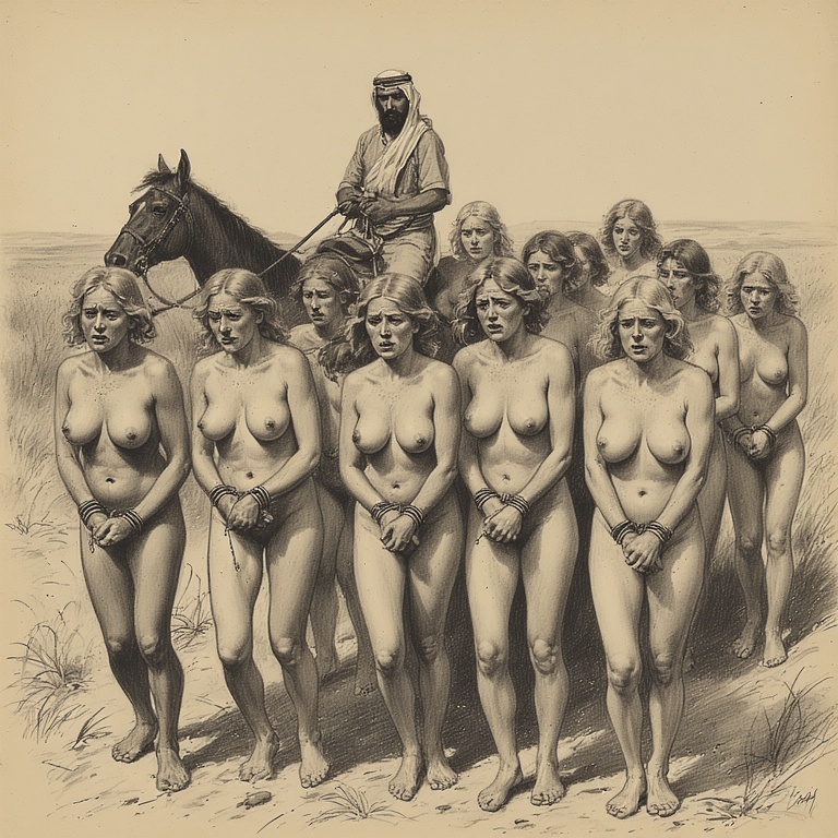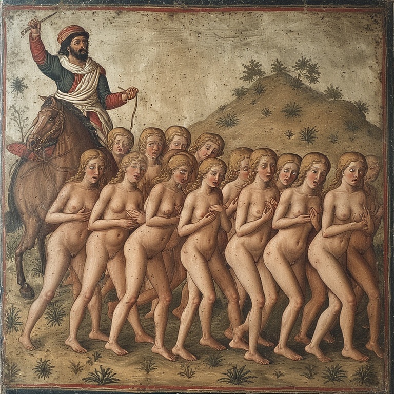 Эмигрантский художник нарисовал трагический эпизод конца Гражданской войны - степные разбойники разграбили санитарный обоз отступающей Белой армии. Сестер милосердия раздели догола и увели в степь, об их дальнейшей судьбе ничего не известно...