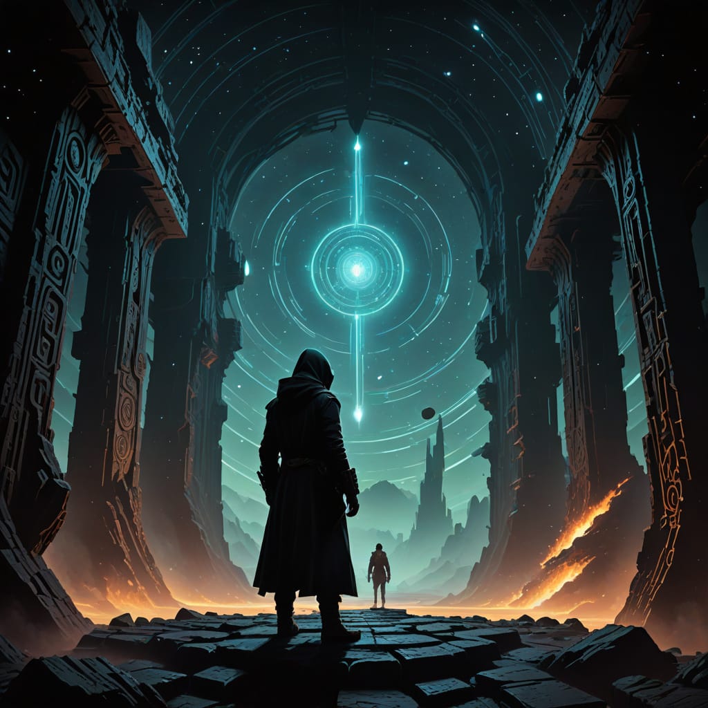 A lone explorer, cloaked in shadows, deciphers glowing glyphs.jpg