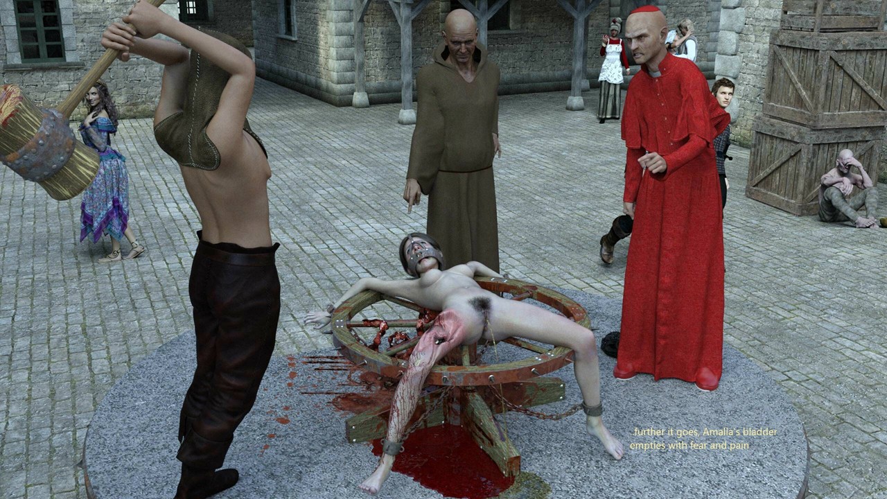 Вопреки распространённому заблуждению, конечности на колесе обычно не ломали (ибо неудобно). Ломали на Х-образной конструкции, а к колесу привязывали уже переломанное тело (в другом комиксе это показано весьма реалистично – я его потом выложу).