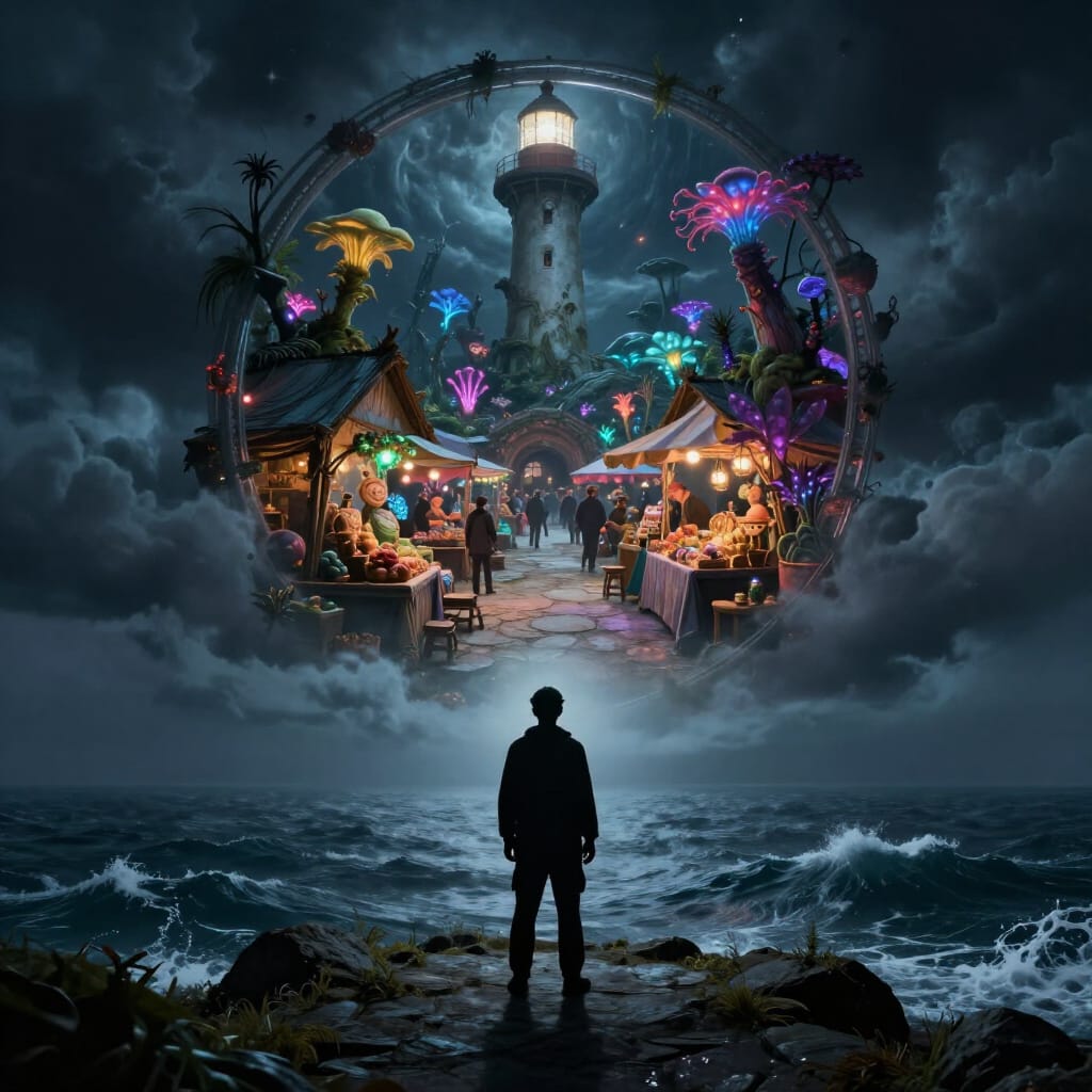 A lone lighthouse keeper, silhouetted against a stormy sea.jpg