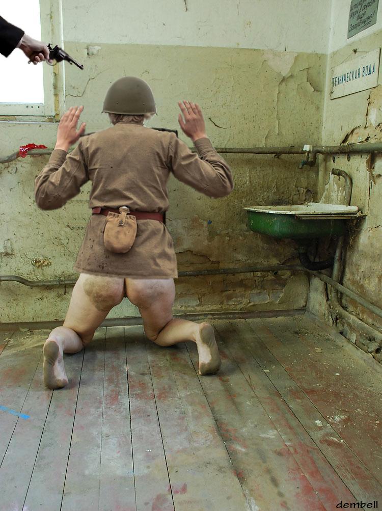 Бійці дивізії СС «Галичина» захопили в полон багато руських баб. Щоб більше зганьбити ворога їх ведуть у полон зі знятими штанами і забороняють прикривати руками пiзду: