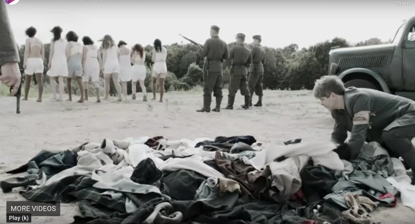 There is a Nazi mass shooting scene, body carry, half naked body pile.