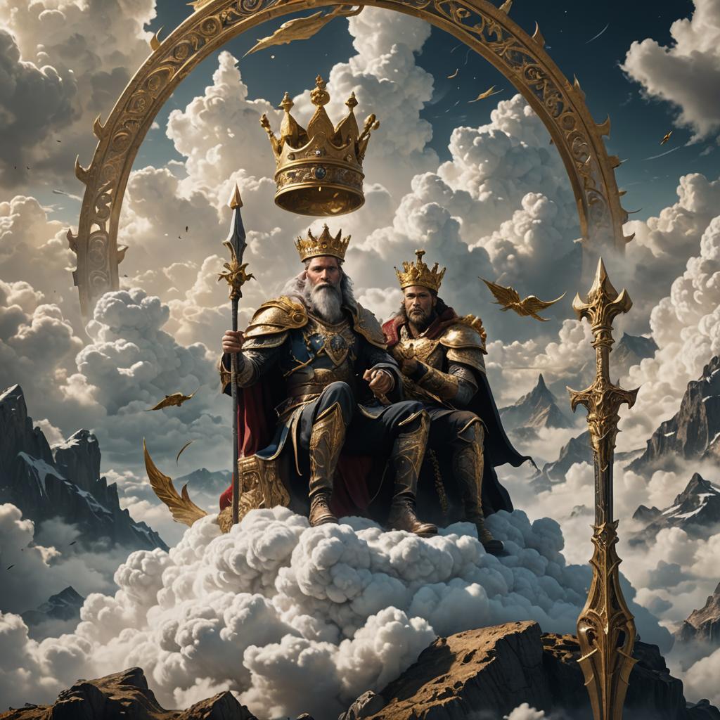 A man sits on a white cloud, with a golden crown on his head, and a sharp sickle in his hand.jpg