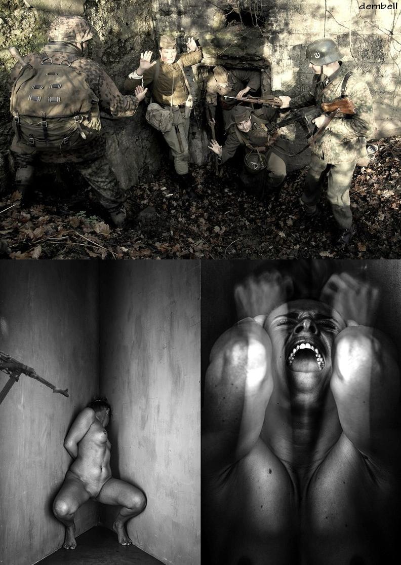 Узятих у полон червоних сучок допитують і катують у підвалі комендатури. При цьому вони повністю оголені: