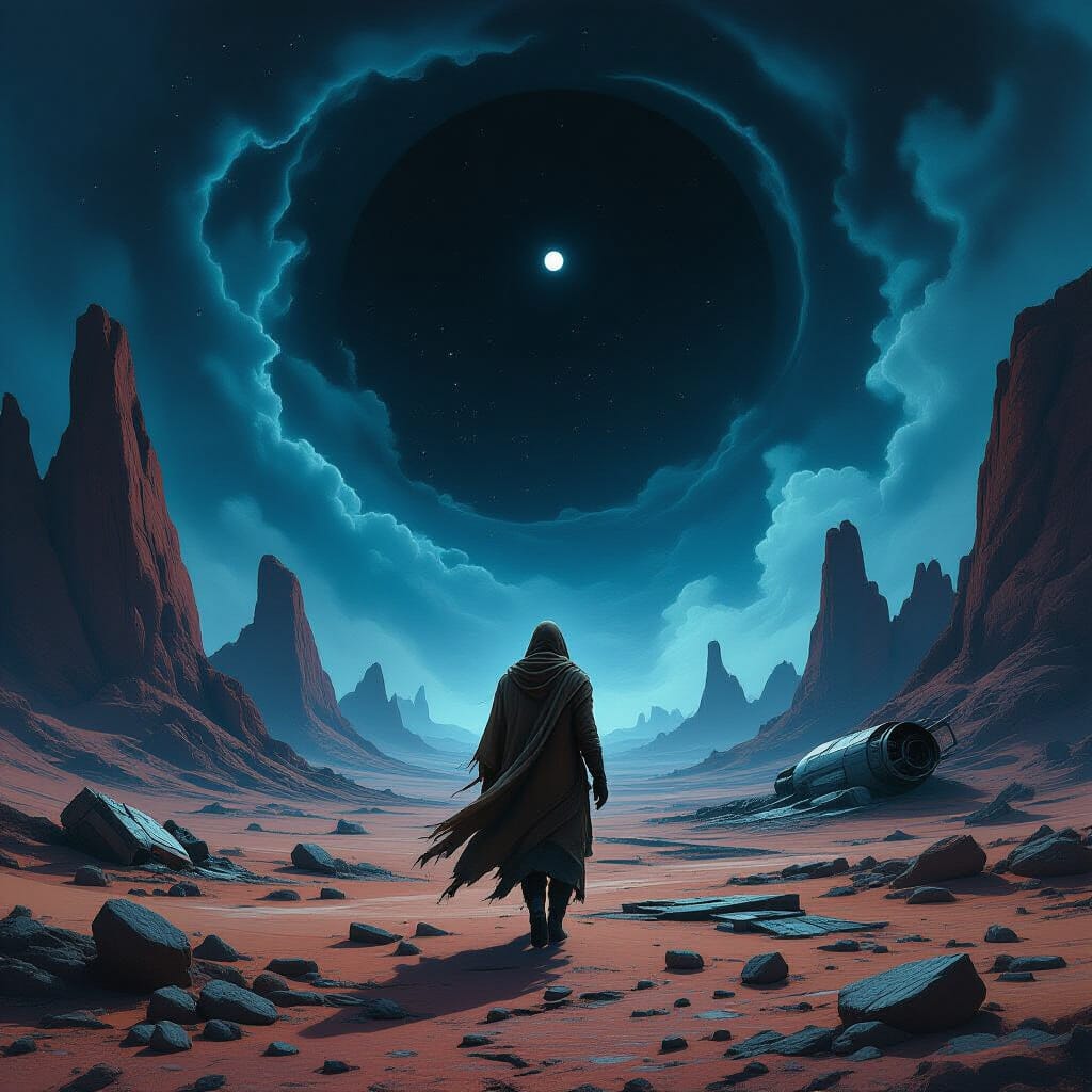 A lone wanderer traverses a desolate, alien landscape.jpg
