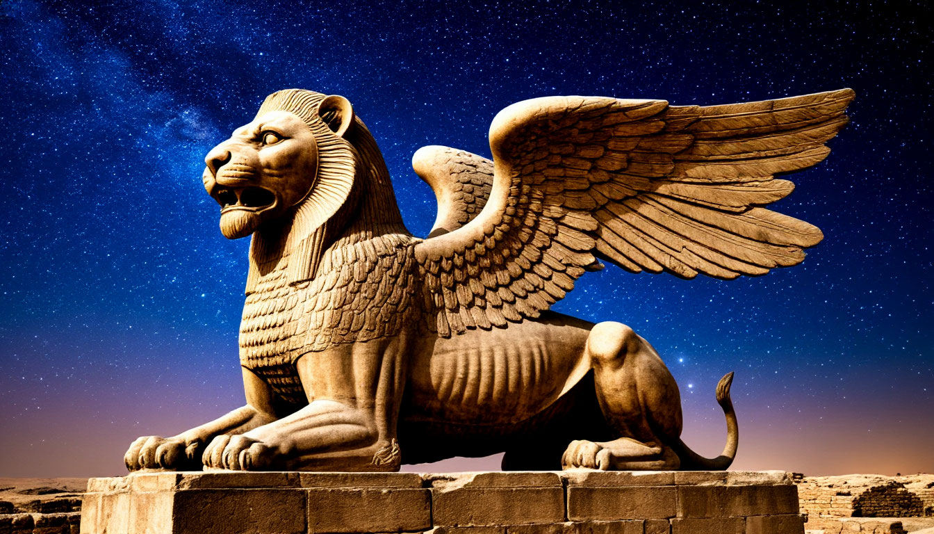 Winged lion with human head in ancient Iraq under starry night sky - S1.jpg